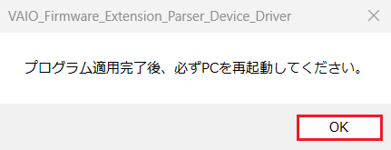 「プログラム適用完了後、必ずPCを再起動してください。」と表示されますので、[OK]をクリックしてください。