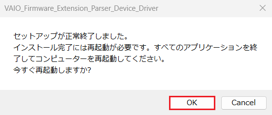 「セットアップが正常終了しました。インストール完了には再起動が必要です。」と表示されましたら、[OK]をクリックしてください。PCが自動的に再起動します。
